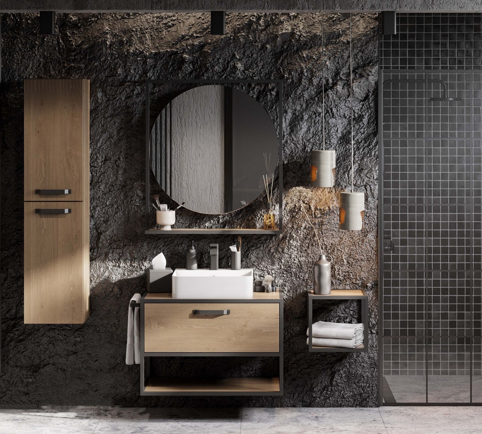 • Оригинальная ручка идеально сочетается с металлическими черными профилями и полотенцедержателем. Полотенцедержатель можно установить опционально по желанию клиента слева или справа
