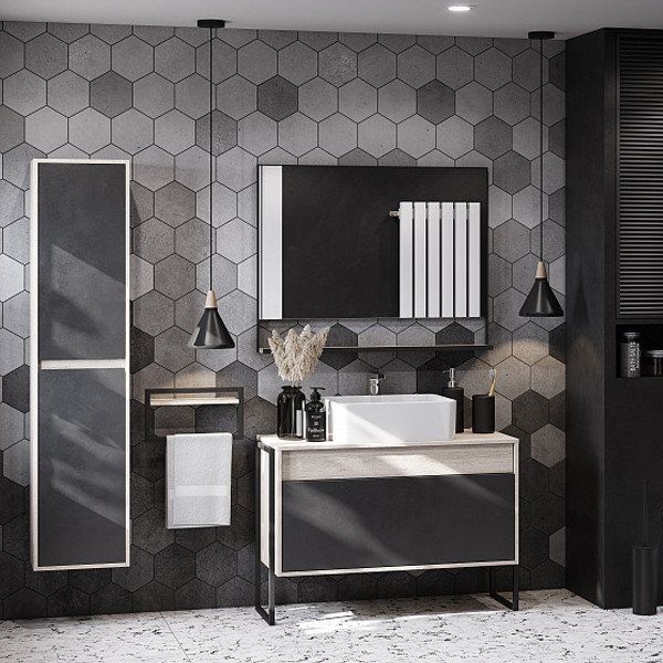 Модуль 100 коллекции Лофт Урбан функционально состоит из двух ящиков полного выдвижения. Верхний ящик тумбы комплектуется внутренней организацией пространства: в нем очень удобно хранить небольшие аксессуары и принадлежности. Вместительный нижний высокий ящик подойдет для более крупных предметов. Функция полного выдвижения ящиков и система открывания push-to-open делают использование тумбы особенно комфортным. Подвесной модуль может комплектоваться различными по размеру и дизайну металлическими черными опорами, высокими и низкими, которые крепятся непосредственно под модуль, кроме того, доступен вариант установки модуля и без опор. Корпус тумбы выполнен из влагостойкой ламинированной ДСП в цвете дуб орегон с текстурой натурального дерева, выгодно подчеркнутым фасадами из МДФ в пленке антрацит с эффектом soft touch.