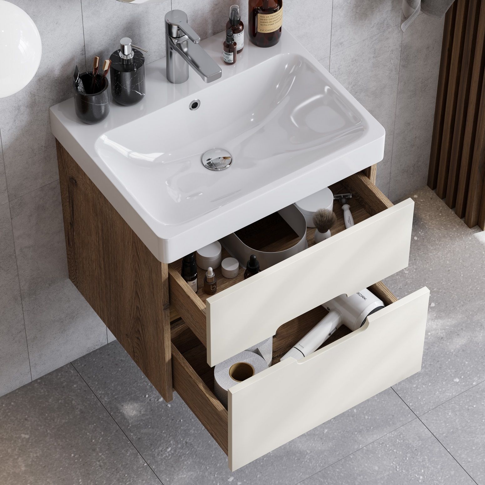 Тумба для комплекта Акватон Оливия 55 бежевый/дуб велл не только не только функциональный предмет интерьера ванной комнаты, но великолепное эргономичное дополнение дизайна, как небольшого, так и крупного помещения. Подвесной способ установки дает возможность не только визуально увеличить пространство, но и обеспечивает быстрый и удобный доступ для уборки.Компания Акватон использует при производстве высококачественные водоотталкивающие материалы (ДСП), соответствующие всем необходимым требованиям безопасности. Коллекция Оливия выполнена в эксклюзивном дизайнерском решении в лучших традициях современного стиля. Светлое дерево, основной цвет исполнения Акватон Оливия, отлично подходящий большинству дизайнерских решений. Тумба под раковину предусматривает удобную и вместительную систему хранения, состоящую из ящиков. Ключевые габариты изделия: ширина 53.2 см, глубина 42.7 см, высота 48 см.Россия родина бренда Акватон, вся продукция производится со строгим соблюдением всех стандартов, благодаря чему можно быть абсолютно уверенным в надежности и высоком качестве. Тумба для комплекта Акватон Оливия 55 бежевый/дуб велл создаст уют и комфорт в любом дизайнерском решении, и ванная комната обретет неповторимый элемент интерьера.