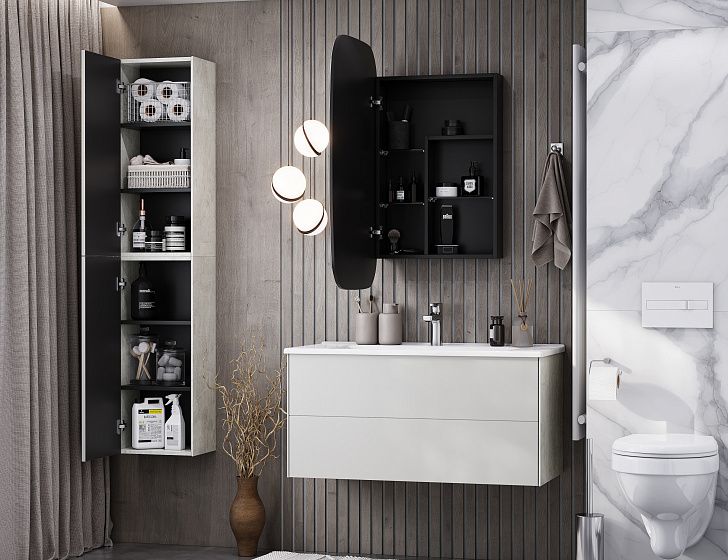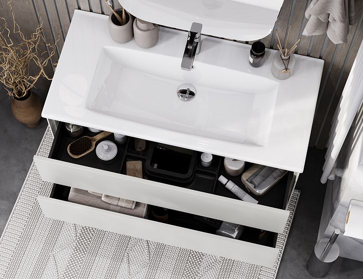 Тумба Сохо 100 функционально состоит из двух вместительных ящиков, оснащенных системой push to open, обеспечивающей надежное, комфортное и бесшумное закрывание. Фасады изделия выполнены из МДФ в пленке в цвете галька серая, корпус из ламинированной влагостойкой ДСП слэйт. Верхний и нижний ящики оснащены системой организации пространства, которая позволяет содержать косметические средства в идеальном порядке. Дополняет тумбу стильная раковина Элина от бренда Santek с удобной чашей. Все внутренние детали тумбы выполнены в цвете антрацит.