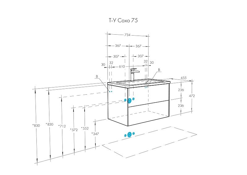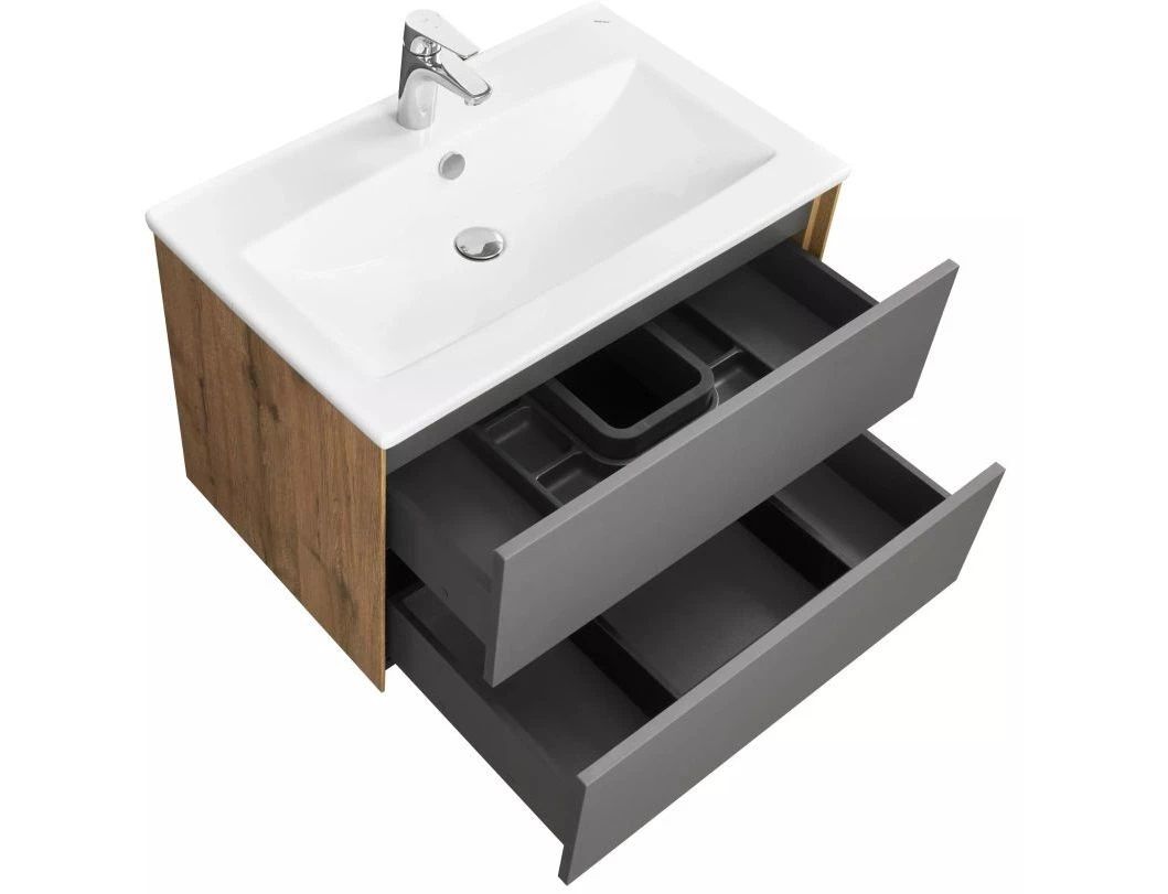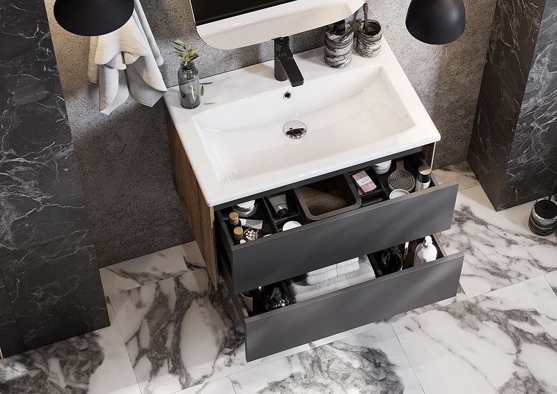 Тумба Сохо 75 функционально состоит из двух вместительных ящиков, оснащенных системой push to open, обеспечивающей надежное, комфортное и бесшумное закрывание. Фасады изделия – МДФ в пленке графит с эффектом soft touch, корпус – ламинированная влагостойкая ДСП Дуб веллингтон. Верхний и нижний ящики оснащены системой организации пространства, которая позволяет содержать косметические средства в идеальном порядке. Дополняет тумбу стильная раковина Элина от бренда Santek с удобной чашей. Все внутренние детали тумбы выполнены в тон фасадов – цвета антрацит.