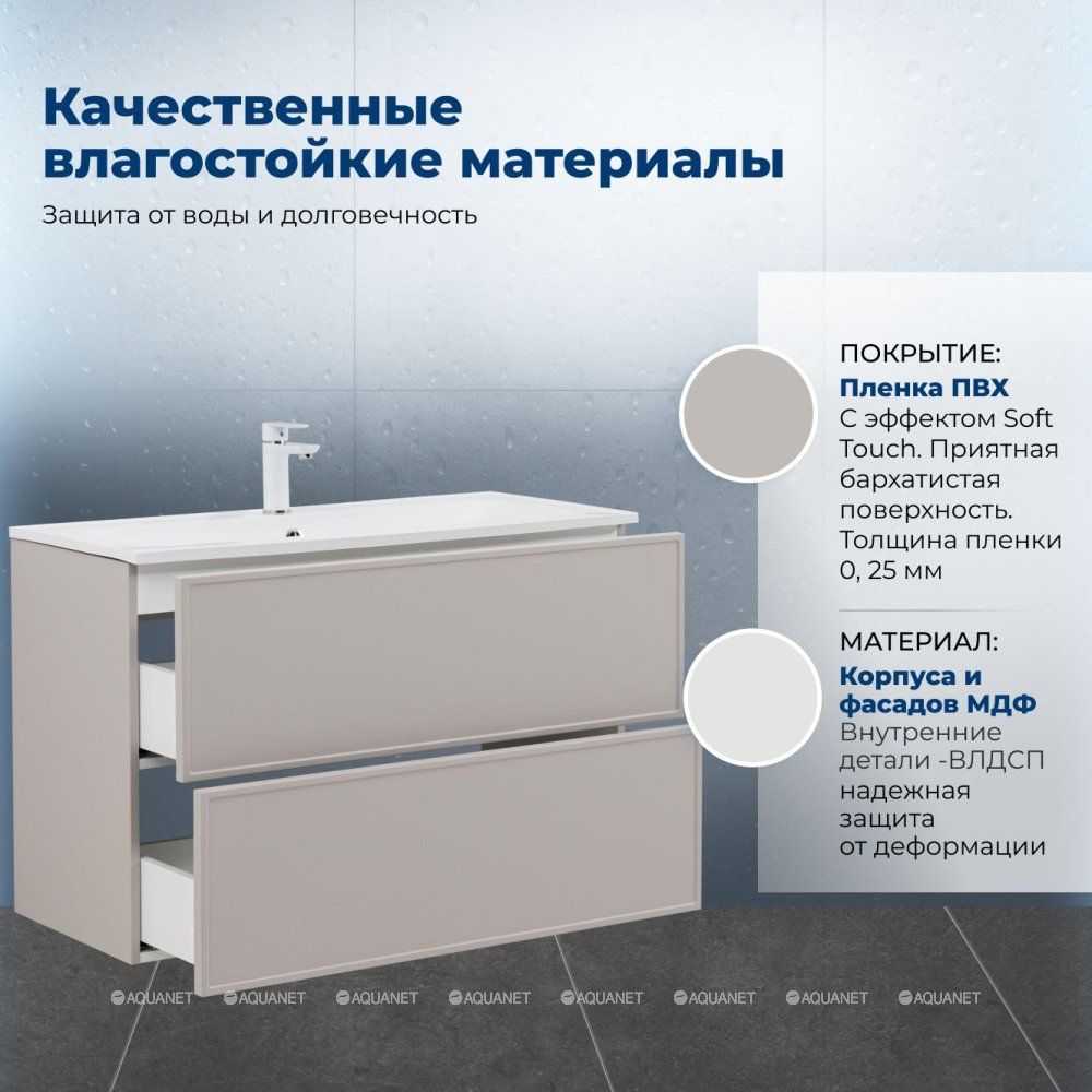 Тумба под раковину Aquanet Арт 100 бежевый — практичное и стильное решение для ванной комнаты. Корпус и фасады изготовлены из МДФ, покрытого суперматовой пленкой ПВХ повышенной прочности с эффектом «Soft touch». Покрытие не только приятное на ощупь, но и обеспечивает надежную защиту от влаги. Полимерная структура пленки не пропускает воду, предотвращая деформацию и сохраняя внешний вид мебели надолго.