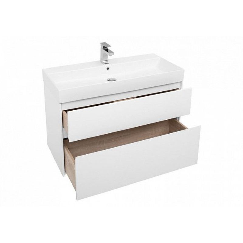 Тумба под раковину Aquanet Бруклин 100 белого цвета предназначена для подвесной установки Изделие отвечает тенденциям минимализма Аскетизм четких линий и обтекаемых форм в ней доведен до совершенства В модели нет никаких выделяющихся деталей, и даже ручки интегрированные, когда открывание происходит за счет выступающей детали верхней или нижней части фасада, которая срезана под углом, в результате чего образуется выемка, служащая ручкой В тумбе ручка устроена таким образом у верхнего ящика в нижней части фасада, а у нижнего – в верхней Такое простое решение добавляет изысканности внешнему виду изделия Раковина из керамики с тонкими изящными бортиками идет размер в размер с тумбой, ширина которой 100 см, в результате чего все изделие выглядит как единое целое Корпус изделия выполнен из выкрашенного белой краской влагостойкого ЛДСП, фасады – из МДФ На контрасте с белизной внешних деталей стильно смотрится корпус выдвижных ящиков, выполненный в цвете «дуб сонома» Нижний ящик тумбы имеет большую зону хранения, верхний разделен на несколько отделений, которые помогут грамотно разложить все необходимое по своим местам
