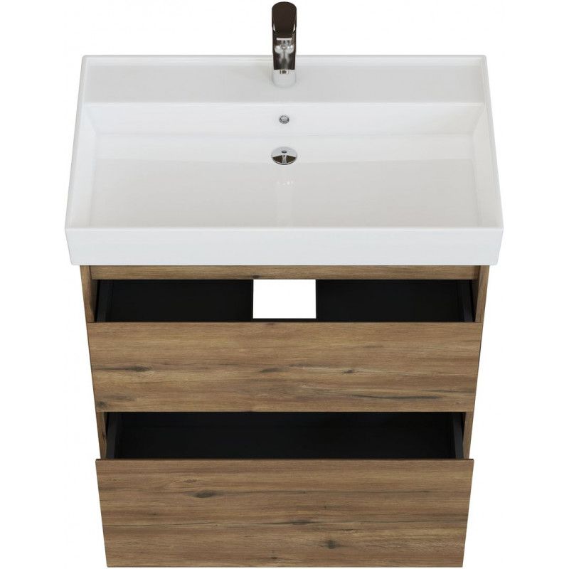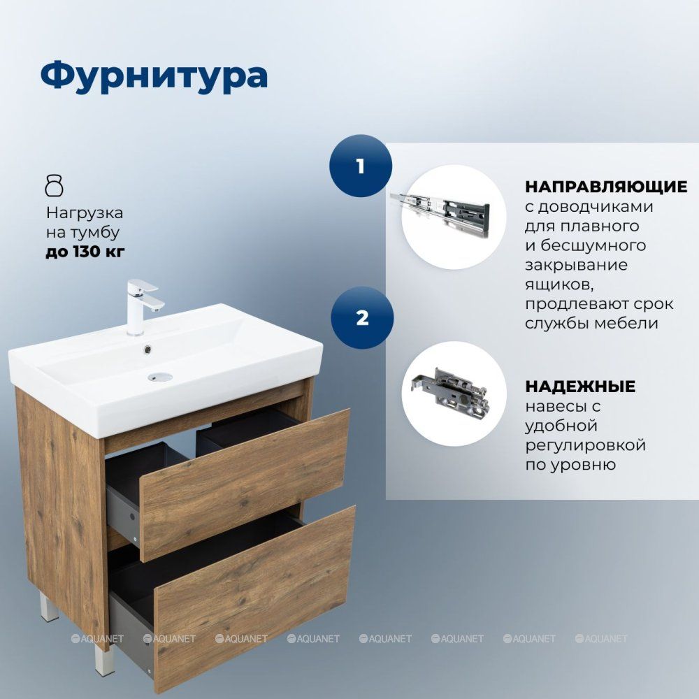Стильная и практичная тумба для ванной комнаты с продуманной конструкцией. Модель Aquanet Nova Lite 2.0 75 выполнена в цвете дуб рустикальный – матовое покрытие имитирует фактуру натурального дерева и не оставляет отпечатков пальцев.