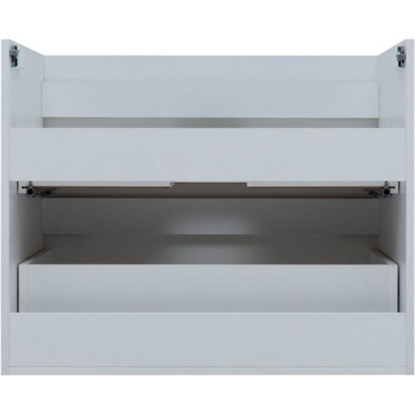Глубина тумбы с раковиной составляет 395 мм, что делает её удобной для небольших помещений. Выдвижные ящики оснащены направляющими с доводчиками для плавного закрывания. Ручка-фрезеровка позволяет открывать ящики "за фасад", сохраняя лаконичный дизайн.