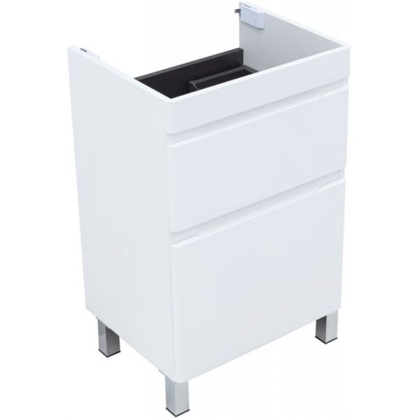 За нижним ящиком предусмотрено место для подводки коммуникаций снизу. Это упрощает монтаж и скрывает трубы. Напольная тумба уже укомплектована четырьмя металлическими опорами.