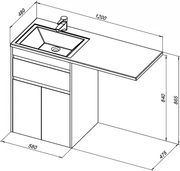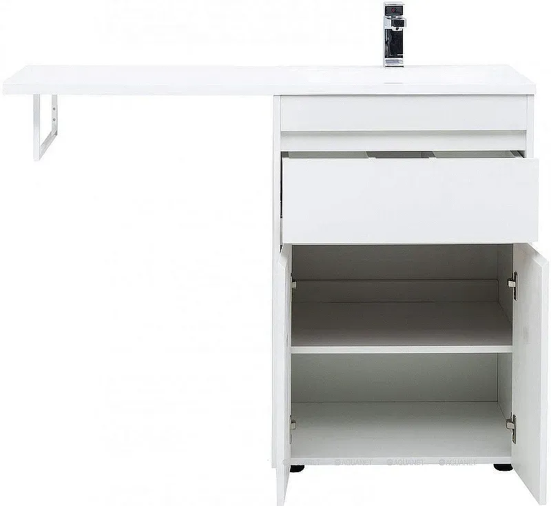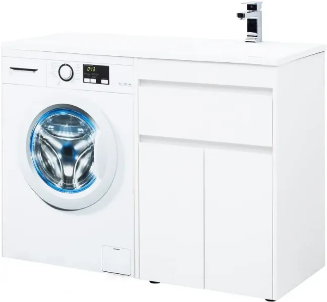 Тумба под раковину Aquanet Токио 120 (напольная, 1 ящик, 2 дверцы) белого цвета представляет новый формат тумб производства Aquanet. Раковина из литьевого мрамора имеет длинную платформу, которая выходит далеко за пределы тумбы. Она предназначена для того, чтобы установить с левой стороны от тумбы стиральную машину. Платформа имеет такую длину, которая позволит спрятать под нее машинку средних размеров с фронтальной загрузкой. Корпус тумбы выполнен из влагостойкого ЛДСП, а фасады – из МДФ с покрытием эмалью. Разнообразные зоны хранения в тумбе шириной 580 мм скрыты в ящике и за распашными дверками. Тумбу можно использовать и без соседства со стиральной машиной, а свободное пространство под платформой раковины занять подкатной тумбой, приспособлениями для уборки помещения или столиком. Тумба предлагается без раковины