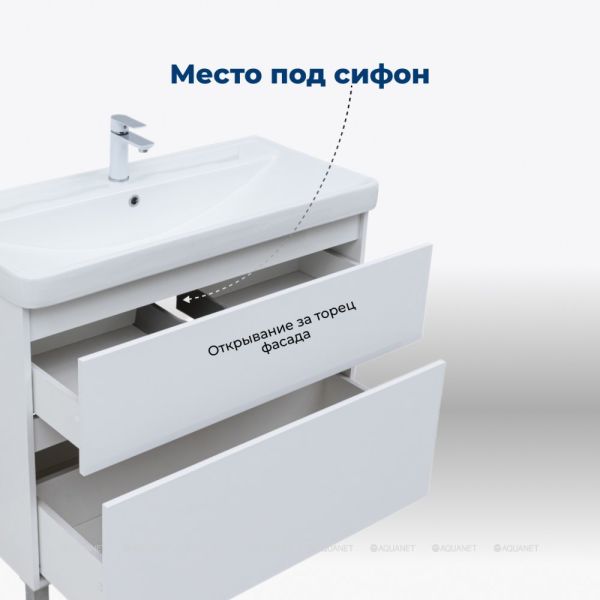 Пластиковое ограждение сифона в сером цвете аккуратно скрывает коммуникации. Прочное дно нижнего ящика, изготовленное из влагостойкой ЛДСП толщиной 16 мм, позволяет хранить даже тяжелые предметы. Предусмотренное место за нижним ящиком для подводки коммуникаций снизу упрощает монтаж и подключение сантехники. Aquanet Вега 100 – это оптимальное решение для создания стильного и практичного интерьера ванной комнаты.