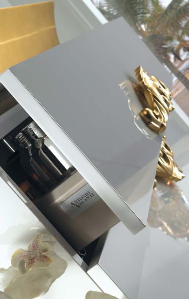 • Внутренняя поверхность выдвижных ящиков отделана вручную эко-кожей с маркировкой Armadi Art и строчкой ручной работы
