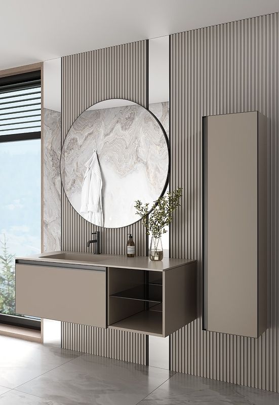 Главной особенностью коллекции являются обрамления фасадов из алюминия в самых трендовых цветах: графит, матовое золото, матовый черный и серебро. Эти обрамления идеально дополняют сантехнику в ванной комнате.