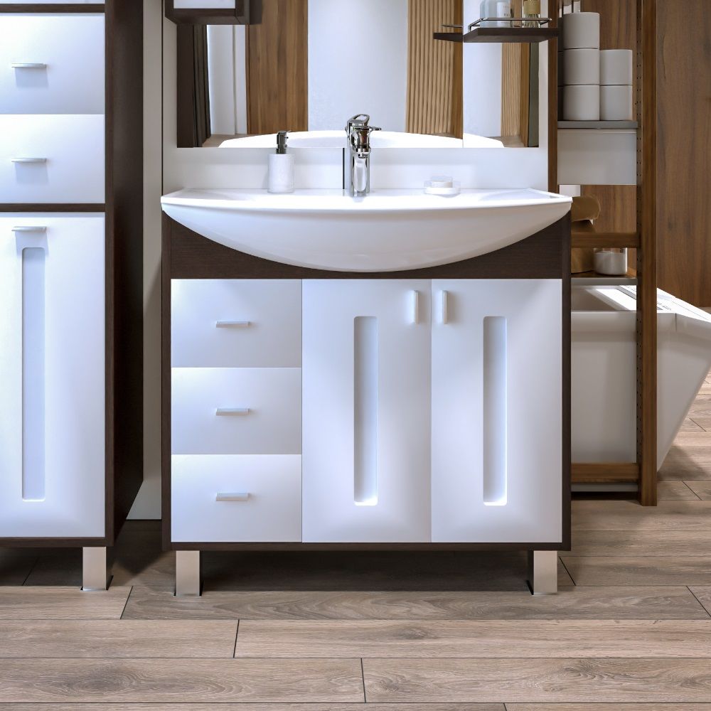 Удобная система хранения позволяет размещать все необходимое для гигиенических процедур, а её продуманные размеры отлично вписываются даже в небольшие помещения. Стильные ручки и элегантные фасады придают тумбе особый шарм, а разнообразие цветовых решений позволит выбрать модель, соответствующую любому интерьеру – от классического до модерн.