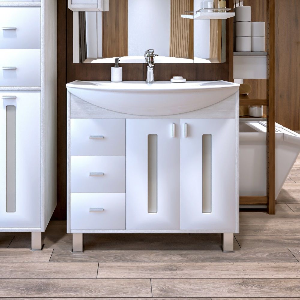 Удобная система хранения позволяет размещать все необходимое для гигиенических процедур, а её продуманные размеры отлично вписываются даже в небольшие помещения. Стильные ручки и элегантные фасады придают тумбе особый шарм, а разнообразие цветовых решений позволит выбрать модель, соответствующую любому интерьеру – от классического до модерн.