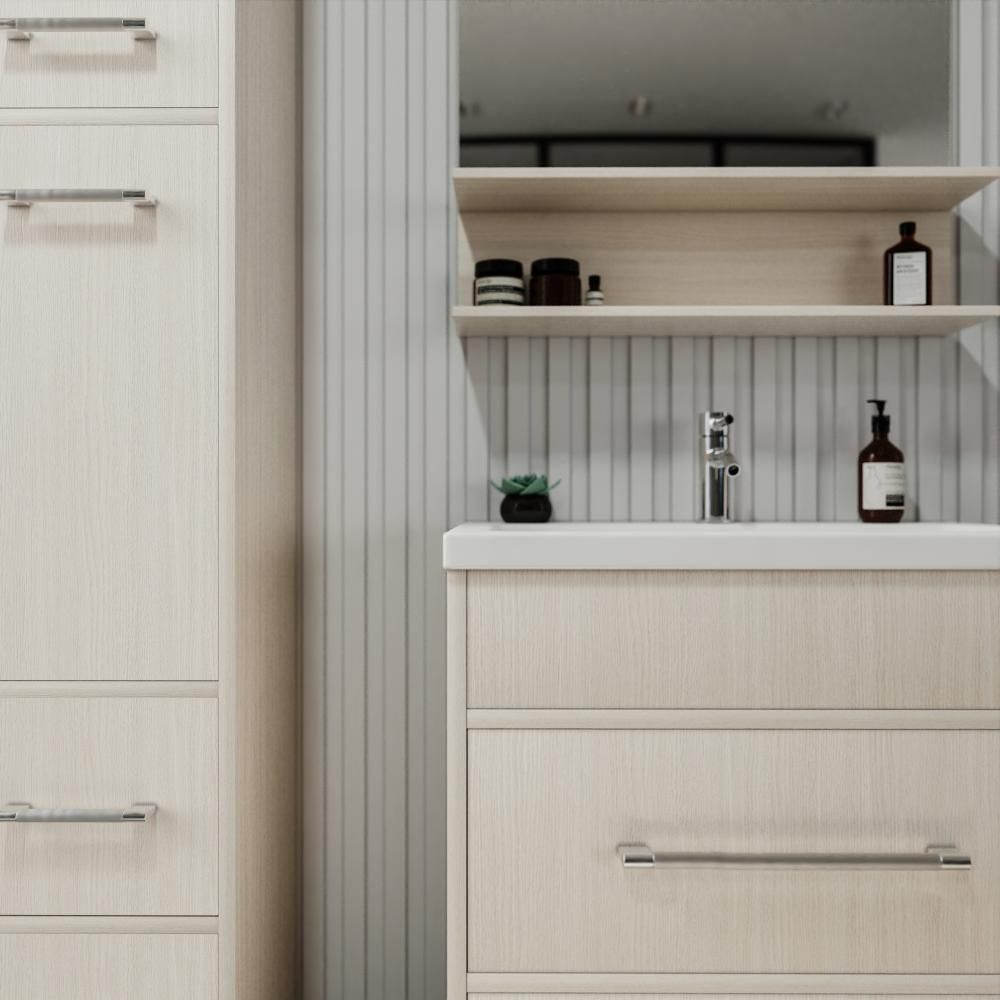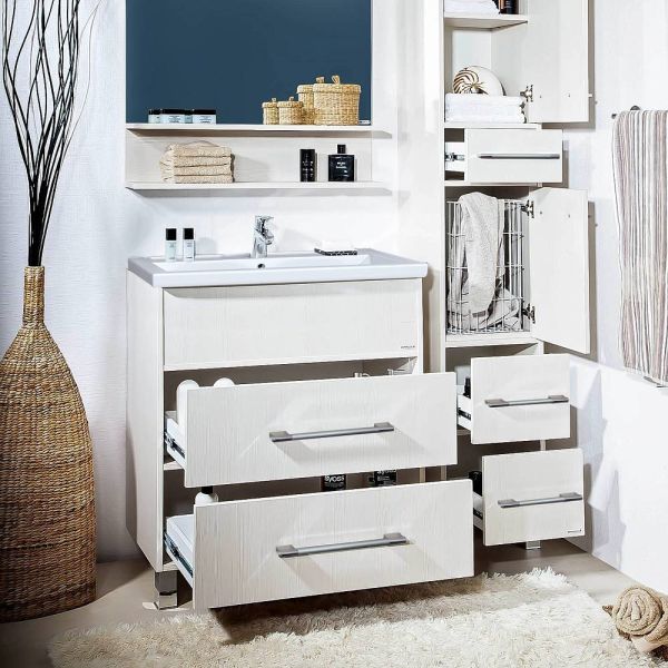 Удобная система хранения позволяет размещать все необходимое для гигиенических процедур, а её продуманные размеры отлично вписываются даже в небольшие помещения. Стильные ручки и элегантные фасады придают тумбе особый шарм, а разнообразие цветовых решений позволит выбрать модель, соответствующую любому интерьеру – от классического до модерн.