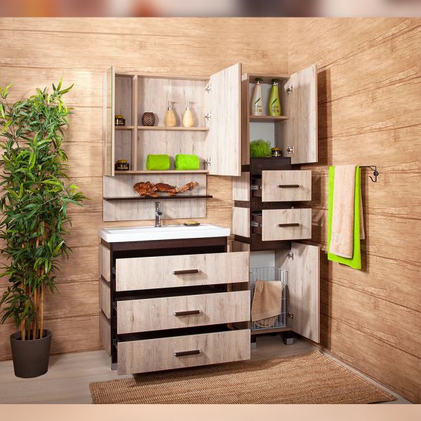 Удобная система хранения позволяет размещать все необходимое для гигиенических процедур, а её продуманные размеры отлично вписываются даже в небольшие помещения. Стильные ручки и элегантные фасады придают тумбе особый шарм, а разнообразие цветовых решений позволит выбрать модель, соответствующую любому интерьеру – от классического до модерн.