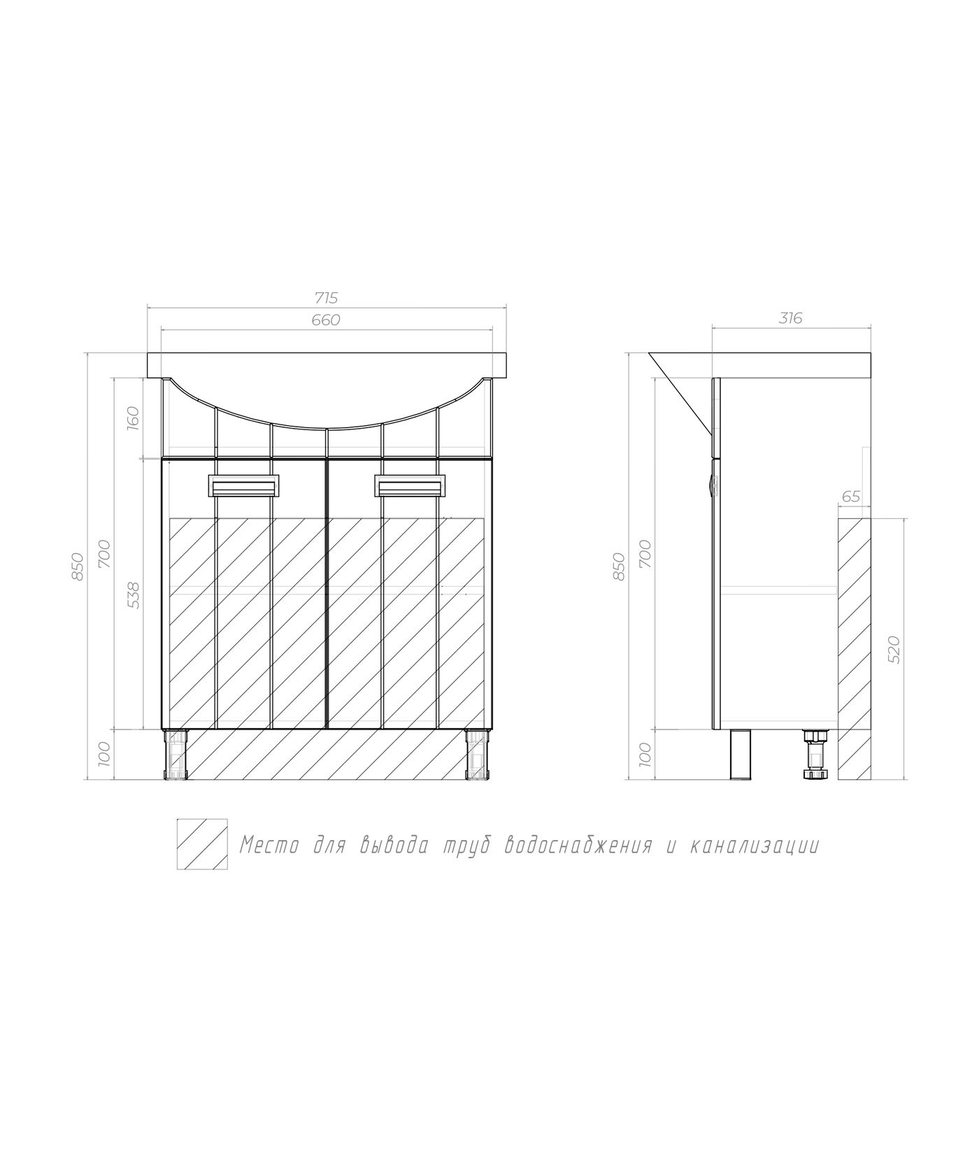 Тип:Тумба под раковинуТип установки:напольнаяРазмер:660?316?800 мм (Ш?Г?В)Объем упаковки:0.159Материал корпуса:ЛДСППокрытие корпуса:матовоеМатериал фасада:ЛМДФПокрытие фасада:глянцевая пленка ПВХМатериал раковины:керамикаФурнитура:хромФорма мебели:прямоугольнаяФорма раковины:прямоугольнаяСтиль:современный стиль (Hi-Tech)