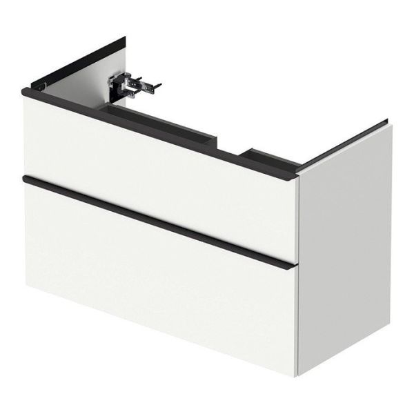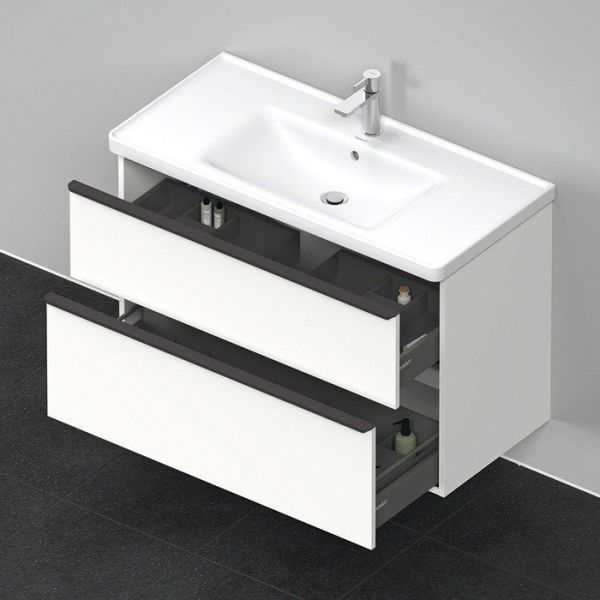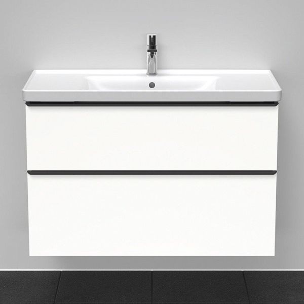 Тумба под раковину Duravit D-Neo DE435601818 подвесная белая Duravit D-Neo DE435601818 Подвесная тумба для раковины 1005*480 мм (белый матовый). С 2 выдвижными ящиками, верхний ящик с вырезом для сифона. Раковина в комплект не входит, рекомендована раковина 2367100000.