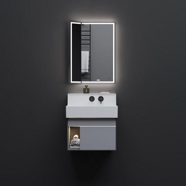 Тумба под раковину Kerama Marazzi Logica M 65 см — это современное и технологичное решение для организации пространства в ванной комнате. Модель выполнена в стильном сером цвете с комбинацией глянцевых и матовых поверхностей, что придает ей динамичный и элегантный вид. Тумба оснащена интеллектуальной подсветкой, которая активируется при приближении, создавая удобство использования в вечернее время и добавляя интерьеру современности.