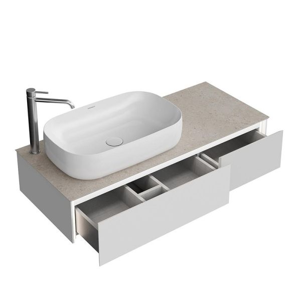 Подвесная тумба MAGICA в размере 120 см оснащена двумя выдвижными ящиками. Тумба используется с керамической столешницей (приобретается отдельно) и одной из накладных или встраиваемых сверху раковин MAGICA. На выбор для создания уникальной ванной комнаты предлагаются три цвета фасадов и корпуса. В мебели MAGICA представлена двойная сенсорная подсветка: изящным контуром подчеркнут фаcад, дополнительное интерьерное освещение предусмотрено в нижней части.