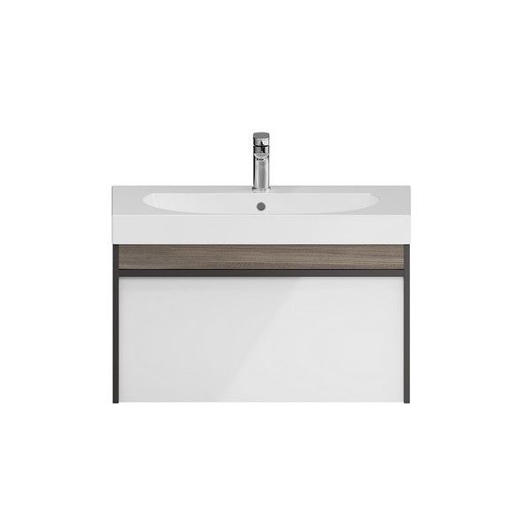 Мебель MODULA может быть использована для установки как мебельных раковин, так и любой из накладных, которые в этом случае устанавливаются на керамическую столешницу CANALETTO. Боковины тумбы выполнены в цвете «Арабика», фасад — белый глянцевый.