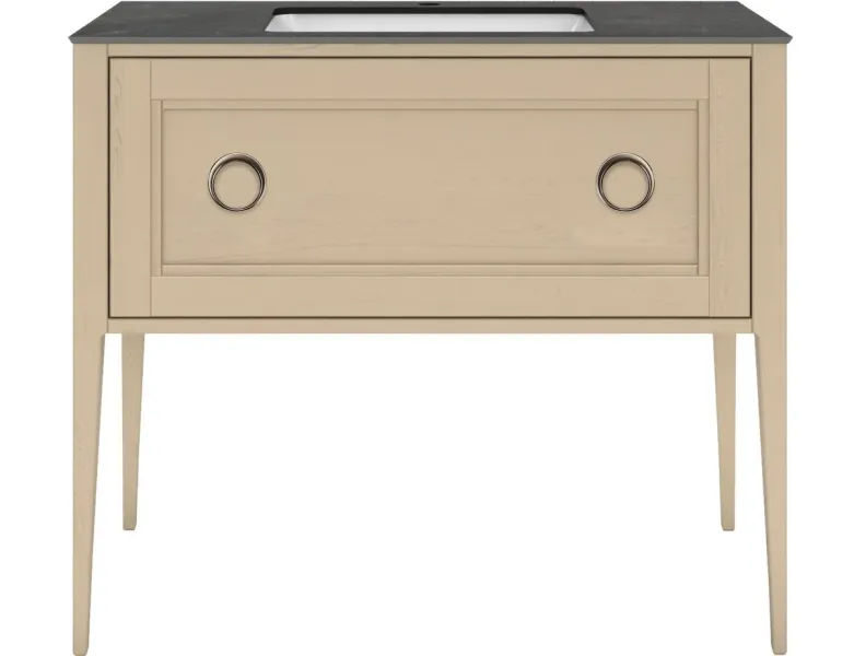 Напольная тумба с одним выдвижным и одним внутренним ящиками выполнена из массива ясеня с отделкой «открытая пора». Вместительный ящик с плавным закрыванием украшен двумя крупными ручками. Сочетается с керамическими столешницами PLAZA Classic шириной 100 см. Подходит для установки раковин с типом монтажа «накладная на столешницу» и «встраиваемая сверху».