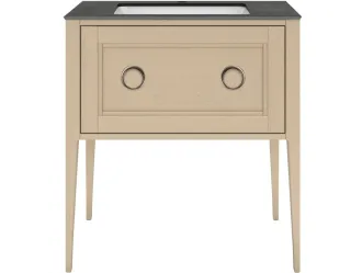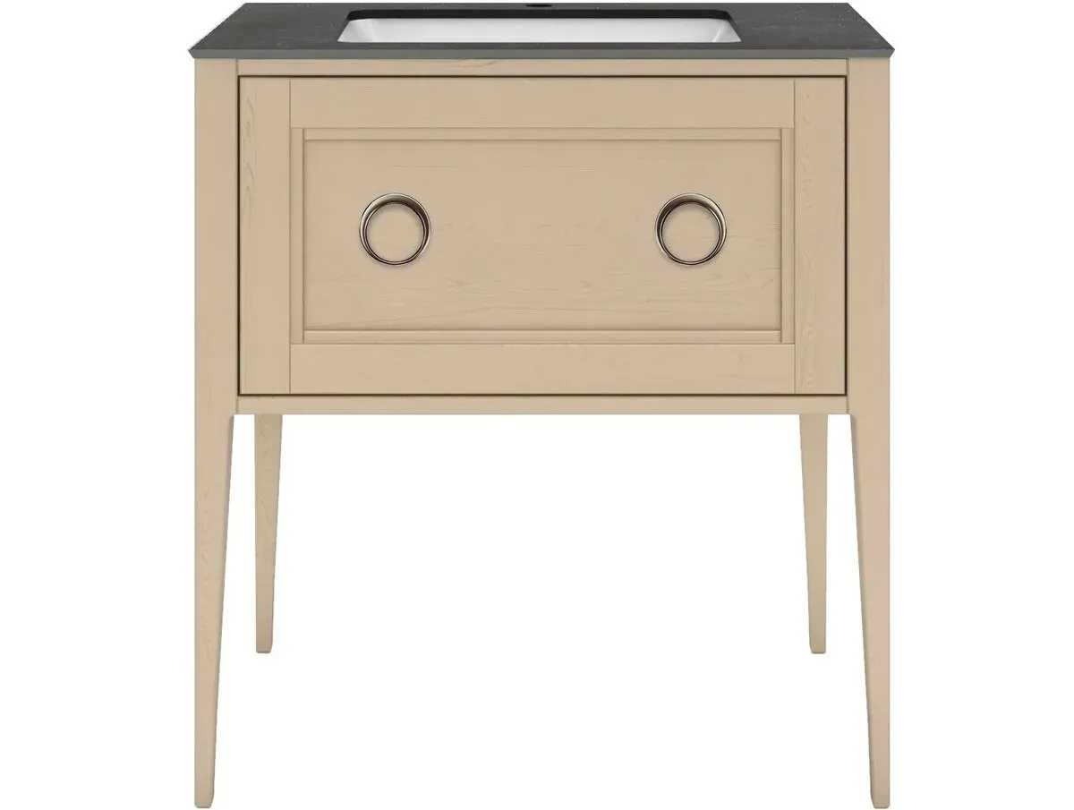 Напольная тумба с одним выдвижным ящиком выполнена из массива ясеня с отделкой «открытая пора». Вместительный ящик с плавным закрыванием украшен двумя крупными ручками. Сочетается с керамическими столешницами PLAZA Classic шириной 80 см. Подходит для установки раковин с типом монтажа «встраиваемая снизу».