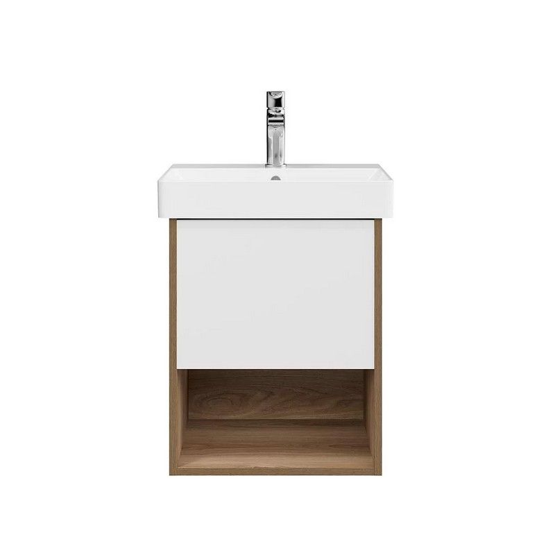 Корпус подвесной тумбы выполнен в цвете «швейцарский вяз». Предусмотрен один выдвижной ящик с удобным открыванием push-to-open и белым матовым фасадом, под ним — открытая полка. Тумба предназначена для установки раковины PRO шириной 50 см.