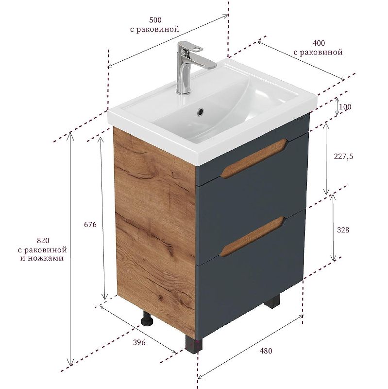 Размеры тумбы без учета раковины и ножек 47х38х66 см.