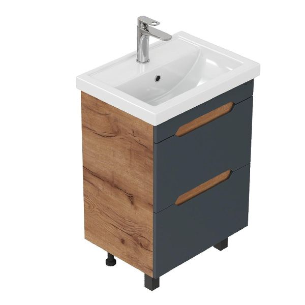 Тумба впишется в любой интерьер благодаря трендовому сочетанию матового графита и золотого дуба, а также поможет эффективно организовать пространство, что особенно важно в небольших ванных комнатах. В её конструкции предусмотрены два ящика, оснащенных направляющими полного выдвижения: нижний ящик подходит для хранения крупных предметов, а верхний, оборудованный практичной системой организации, вмещает мелкие аксессуары.