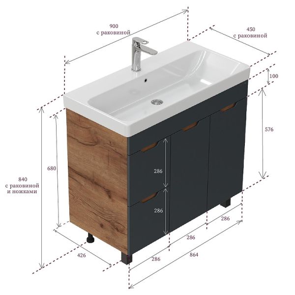 Размеры тумбы без учета раковины и ножек: 86х43х68 см.