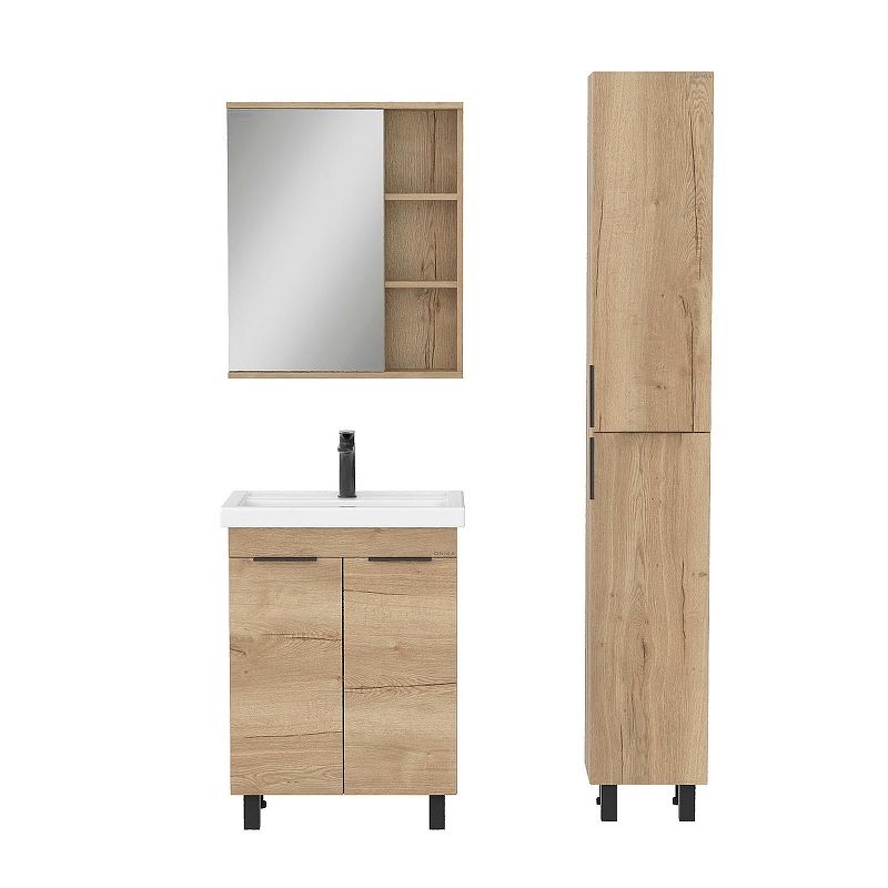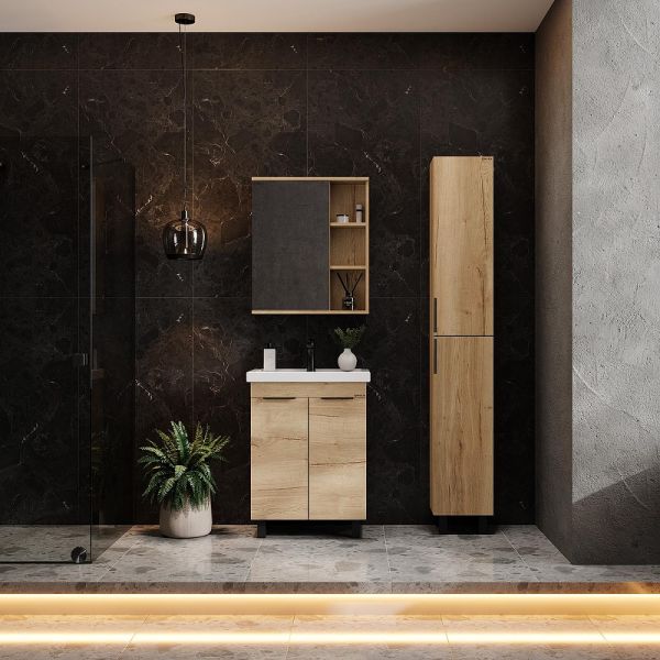 Напольная тумба для ванной комнаты Onika Легран 50 - это сочетание насыщенного древесного декора и благородства металла: роскошная текстура и натуральный цвет дуба дают теплоту, а черная матовая фурнитура добавляют урбанизма и солидности.