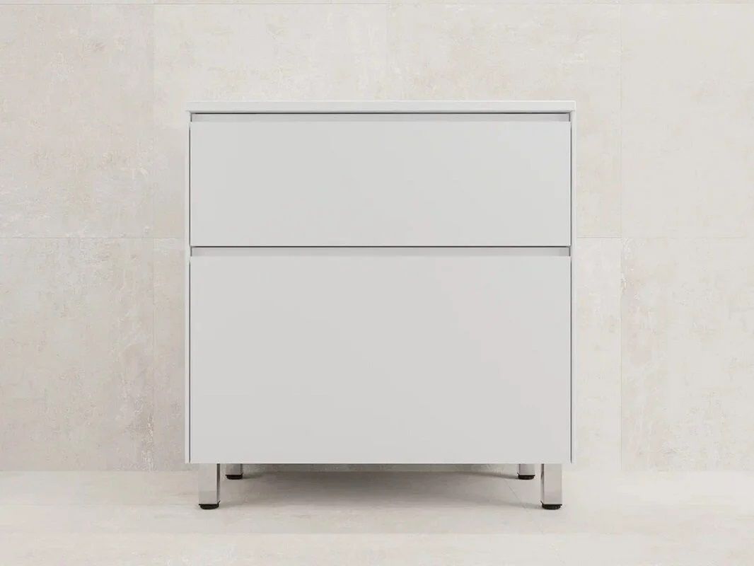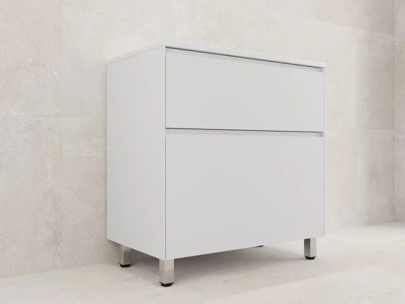 - Матовая белая поверхность придает тумбе современный и элегантный вид. Напольная конструкция обеспечивает устойчивость и надежность, а также легкий доступ к содержимому.