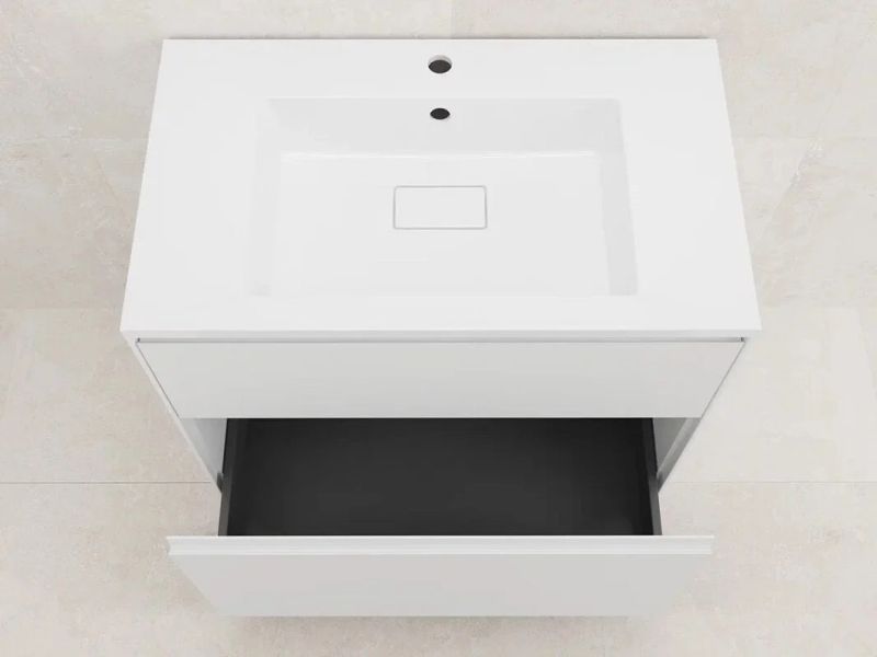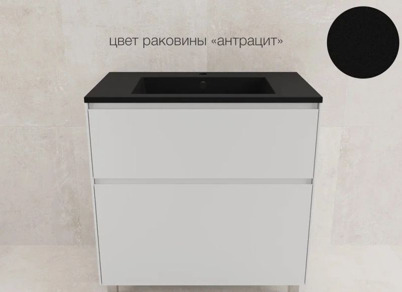 - Тумба оборудована двумя вместительными ящиками, которые позволяют удобно организовать хранение косметических средств, полотенец и других предметов.