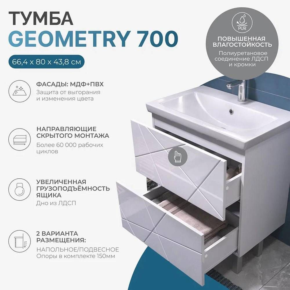 Тумба под раковину напольная VIGO Geometry 016, 70 см. Гарантийный срок 2 года. Монтаж: напольный. Доводчик: нет. Нажимной механизм: да.