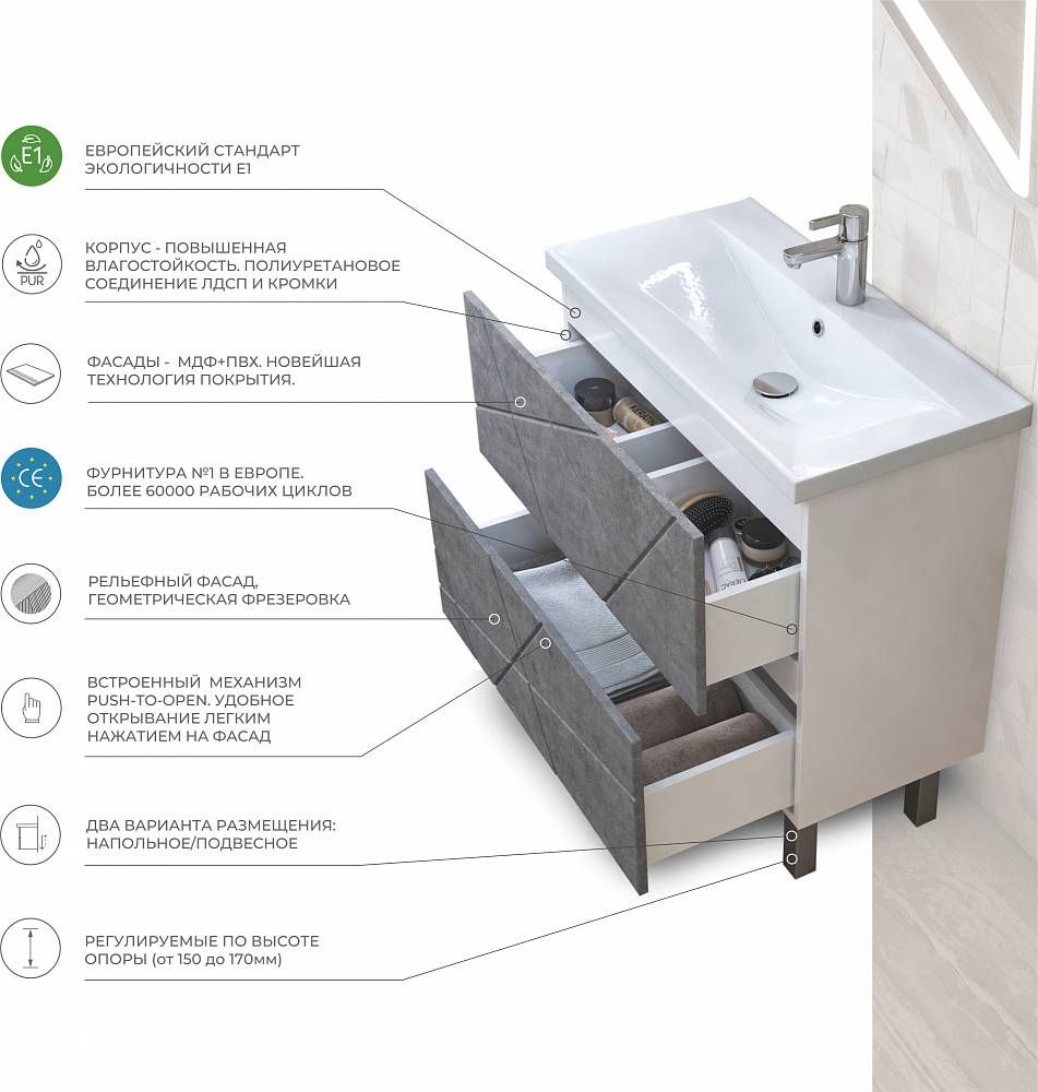 Напольная тумба. 2 ящика; опоры квадратные регулируемые.Специальный сифон Vigo в комплекте. Материл корпуса тумбы: влагостойкая ЛДСПМатериал фасадов: МДФ Покрытие: пленка ПВХЯщики:направляющие полного выдвижения, механизм push-to-open