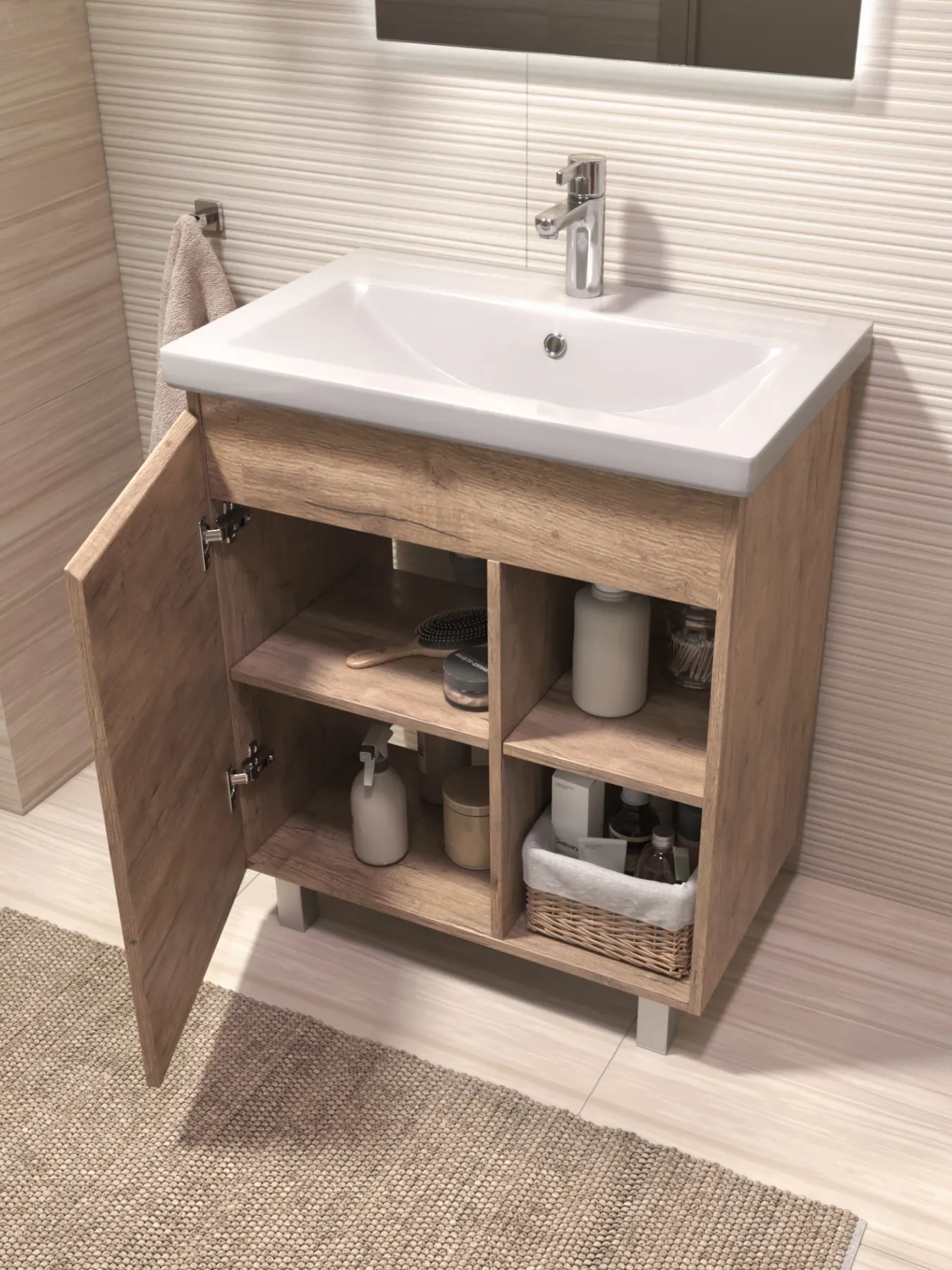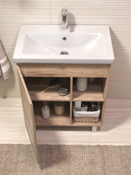 Тумба Milos 70, напольная, 1 дверца, дуб золотой (под ракоовину Como 70). Оснащение: 1 дверца, петли с механизмом доводчика, 2 полки ЛДСП, 4 опоры квадратные регулируемые. Колекция VIGO MILOS: петли с доводчиком, полки из влагостойкой ЛДСП, толщина 16 мм, интегрированные ручки, декор материала с имитацией под дерево.