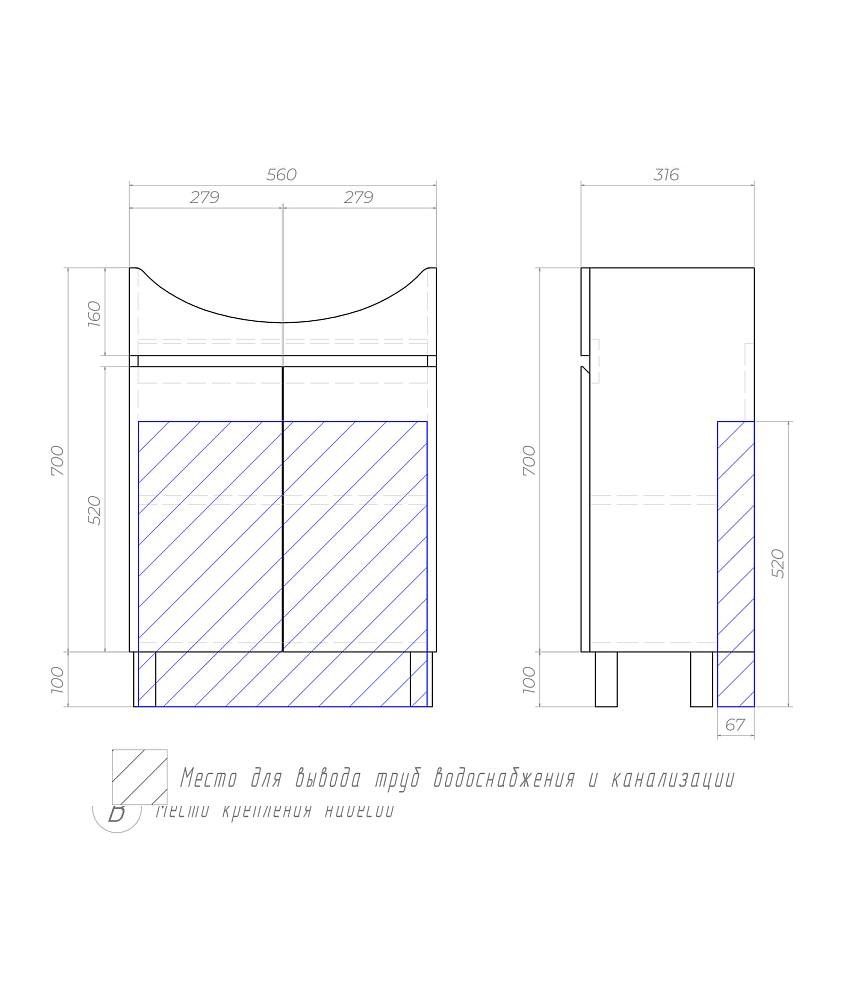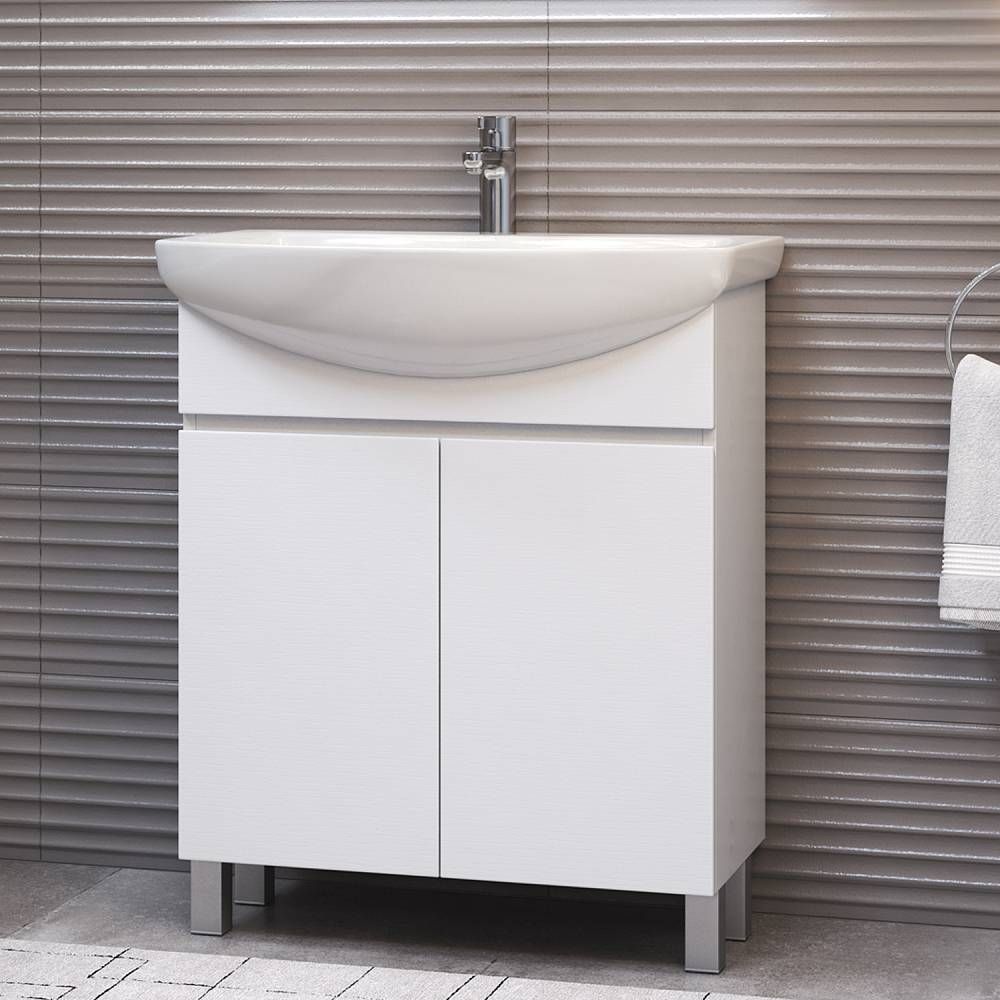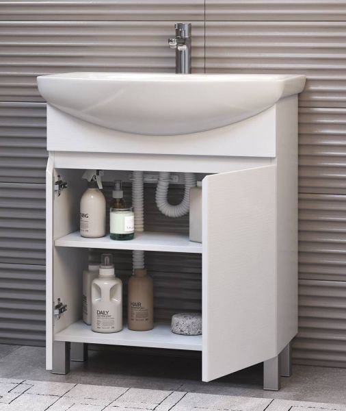2 дверцы, 1 полка ЛДСП, опоры регулируемые квадратные. Специальный сифон Vigo в комплекте.Материал корпуса и фасада: влагостойкая ЛДСПДверцы: петли с механизмом плавного закрыванияОтсутствие лицевой фурнитуры – интегрированная в фасад ручка