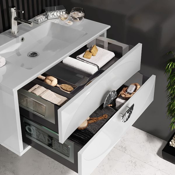 Два вместительных выдвижных ящика с направляющими для плавного и бесшумного закрывания.