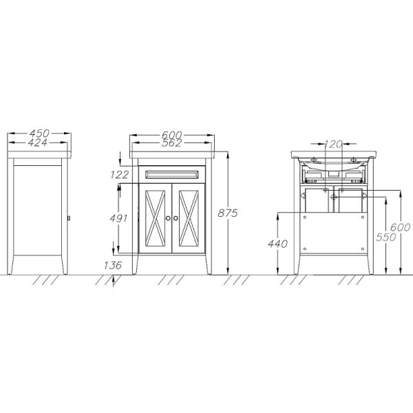 Габариты корпуса тумбы (ШхВхГ): 562х875х424 мм.