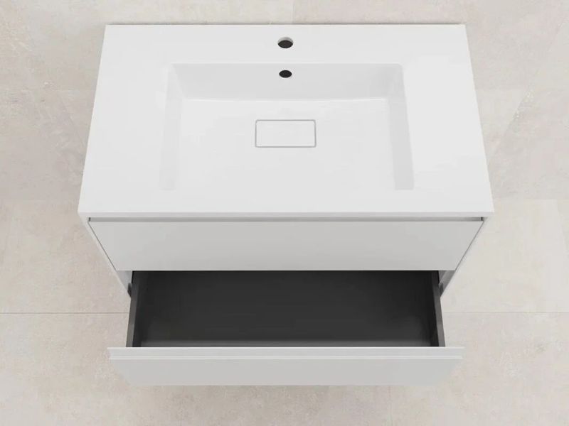 • Тумба имеет ширину 79,9 см, что делает её подходящей для стандартных ванных комнат.