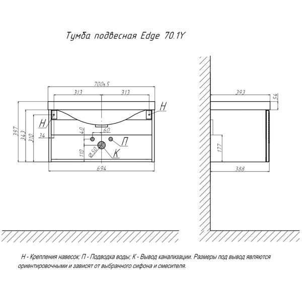 Тумба под раковину подвесная Velvex Edge tp.EDG.9696.70.1Y белый глянец, 70 см купить