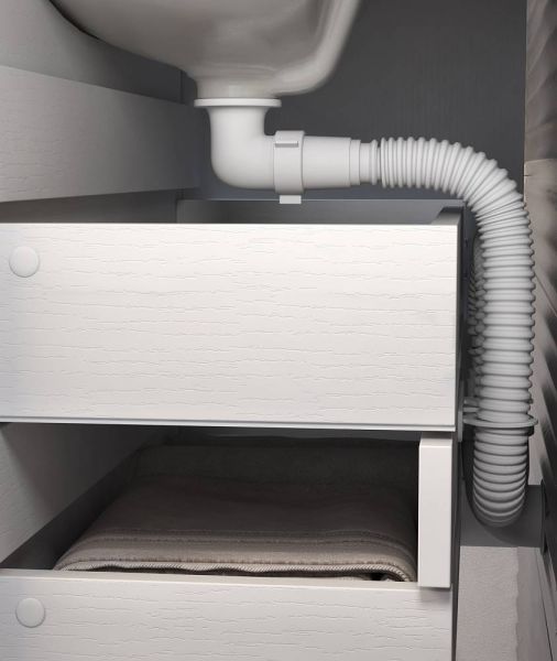 2 ящика. Специальный сифон Vigo в комплекте.Материал корпуса и фасада: влагостойкая ЛДСПЯщики: направляющие полного выдвиженияОтсутствие лицевой фурнитуры – интегрированная в фасад ручка