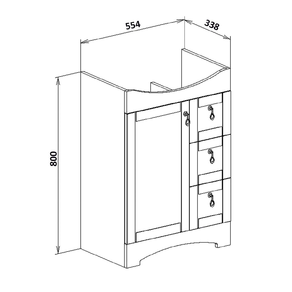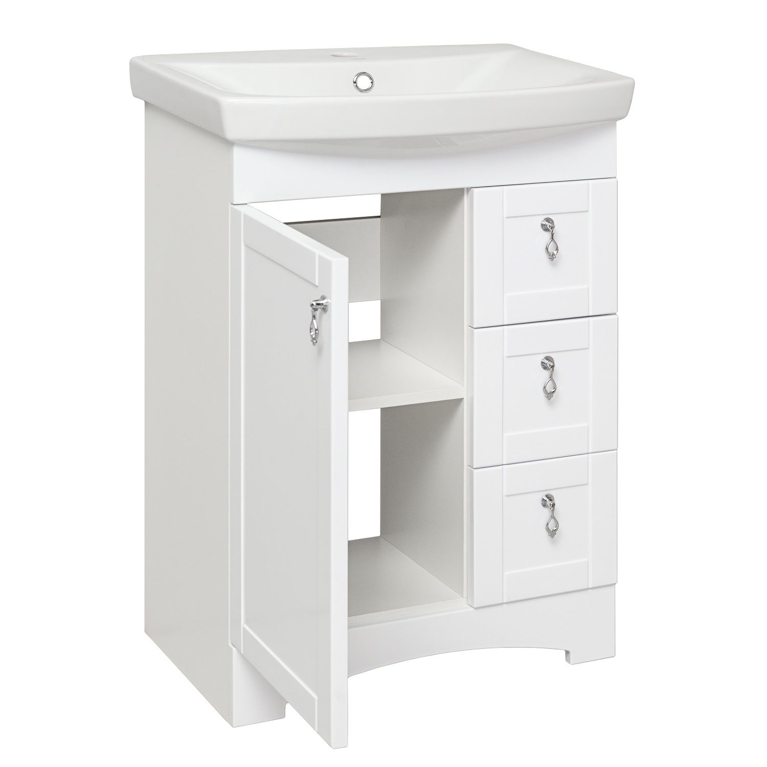 Коллекция мебели «Мерида» выполнена в классическом стиле. Четкие, лаконичные формы и продуманный функционал помогут украсить интерьер любой ванной комнаты. Тумба напольная с одним распашным фасадом и тремя выдвижными ящиками. За левой дверкой - одна внутренняя полка. Ящики - на шариковых направляющих полного выдвижения, петли со встроенным доводчиком, ручки - 4шт, ножки пластик - 4шт (скрыты за нижней фальш-панелью)