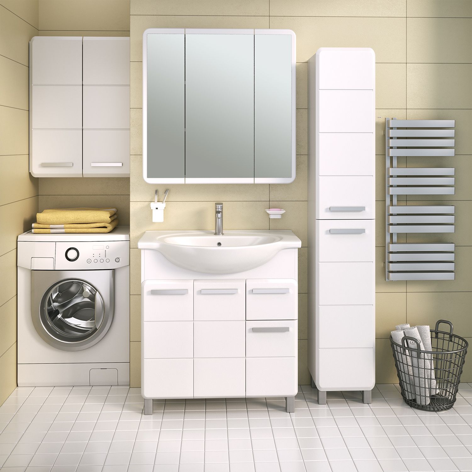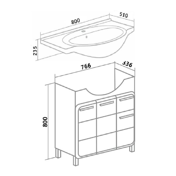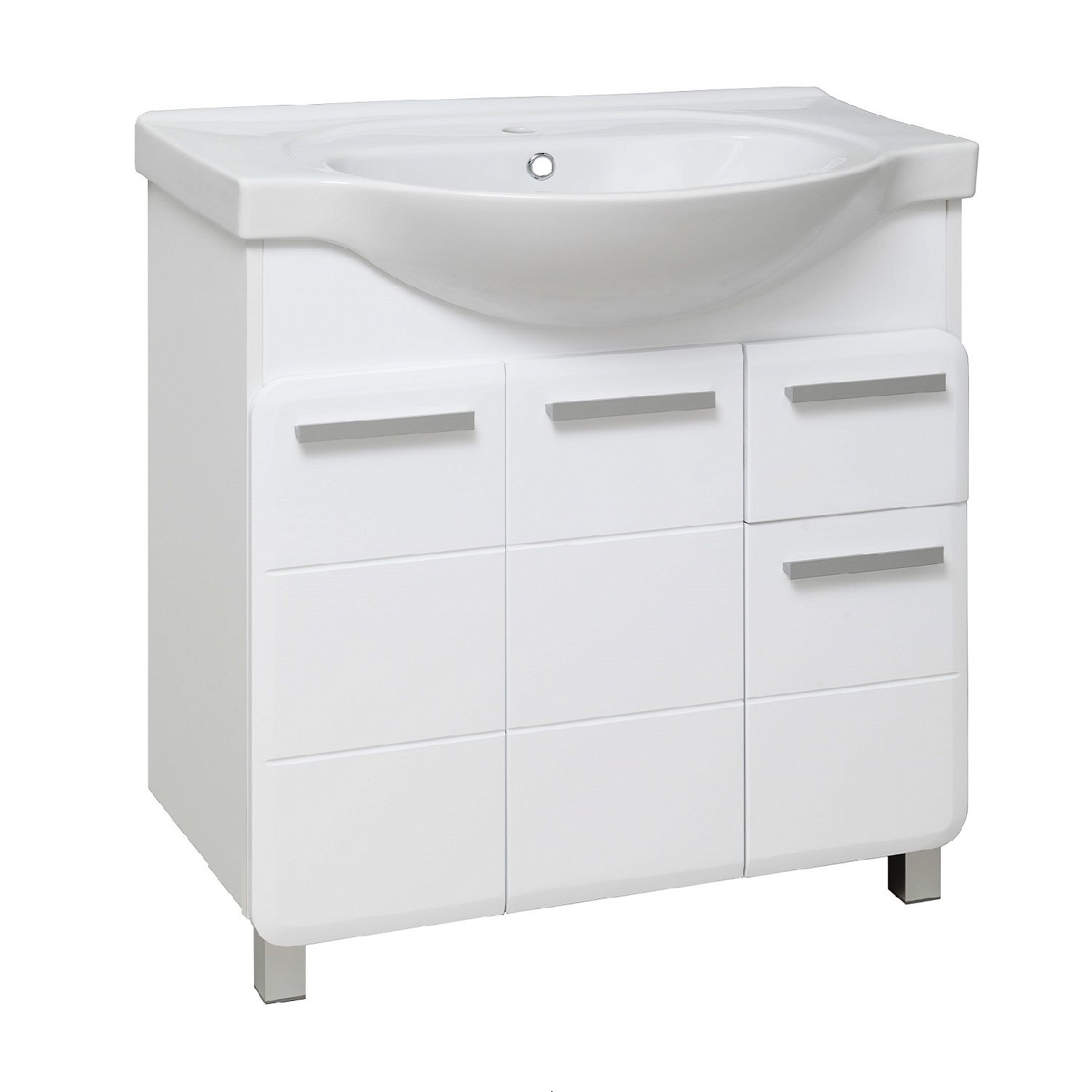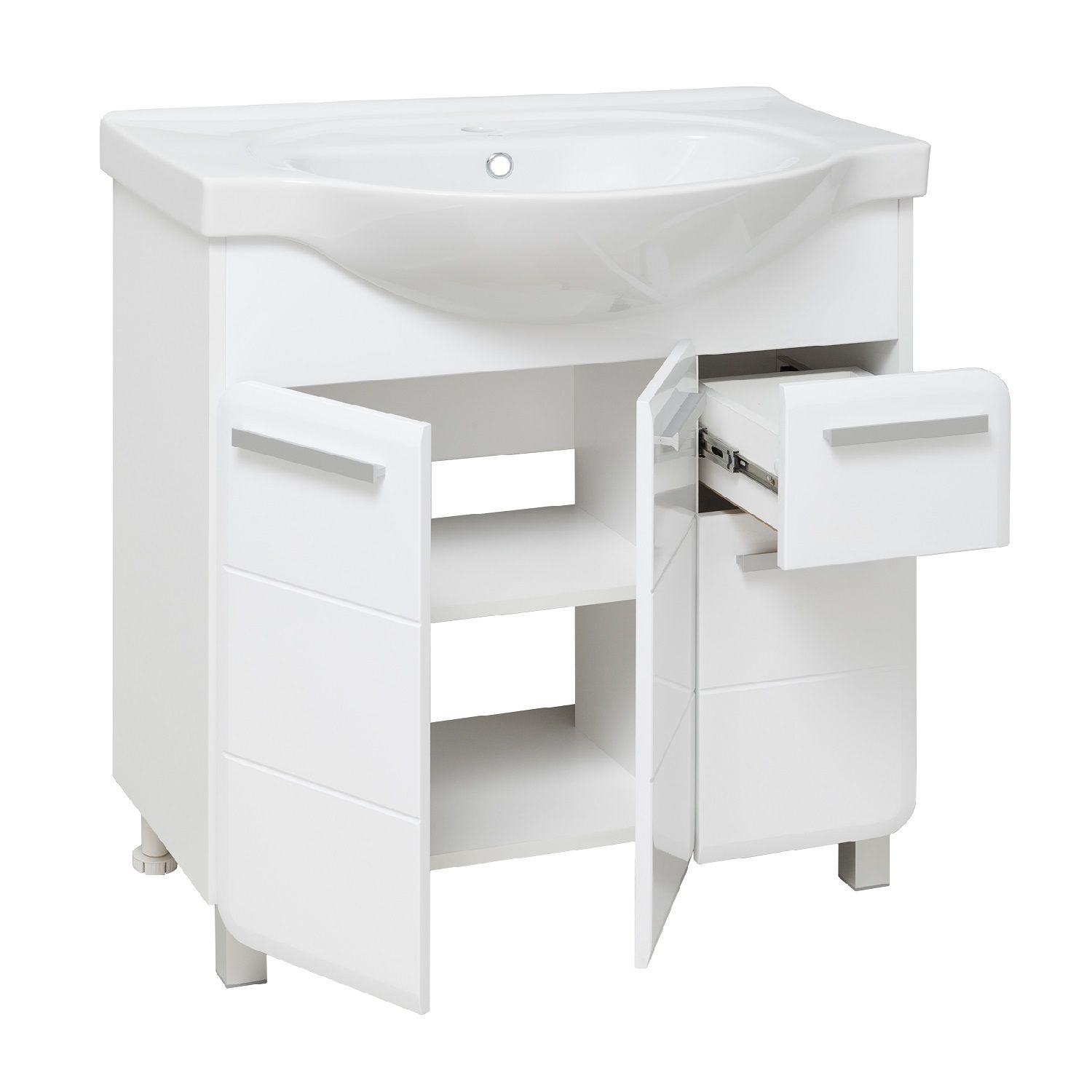 Тумба под умывальник напольная с тремя распашными фасадами и боковым выдвижным ящиком справа. За центральным и левым фасадами - одна внутренняя полка. Ящик - на шариковых направляющих полного выдвижения, петли со встроенным доводчиком, ручки - 4шт, ножки хром матовый - 2 шт, ножки пластик -2шт.