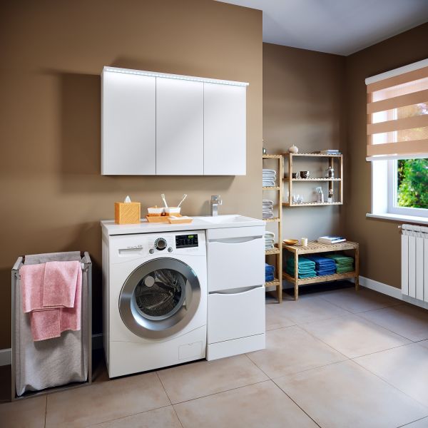 Тумба под умывальник напольная с двумя выдвижными ящиками на шариковых направляющих скрытого монтажа с доводчиком. Устанавливается на 4-е пластиковые опоры, скрытые за нижней съемной фальшь-панелью. Комплект предусматривает установку стиральной машины под крылом умывальника слева от тумбы. Умывальник из литьевого мрамора "Gamma 105 лайт" устанавливается на тумбу и кронштейн.
