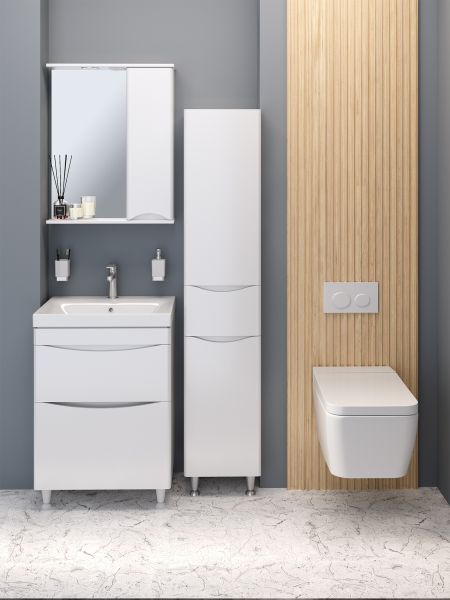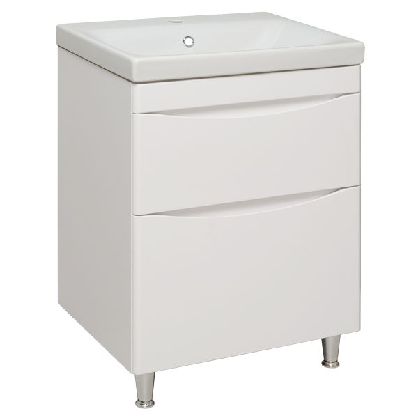 Тумба с раковиной для ванной комнаты RUNO АФИНА - безупречное сочетание модных тенденций с классическим оформлением ванной комнаты. Тумба под раковину в ванную АФИНА имеет два выдвижных ящика на шариковых направляющих, оснащенных системой плавного закрывания. Цвет фасада универсальный - белый, идеально впишется в любой интерьер ванной комнаты. В комплекте идут 2 хромированные и 2 пластиковые ножки. Тумба для ванной комнаты комплектуется накладной керамической раковиной "Moduo" (605х460 мм). Раковина имеет глубину 17,5 см. Мебель для ванной RUNO - красота и практичность в мелочах!