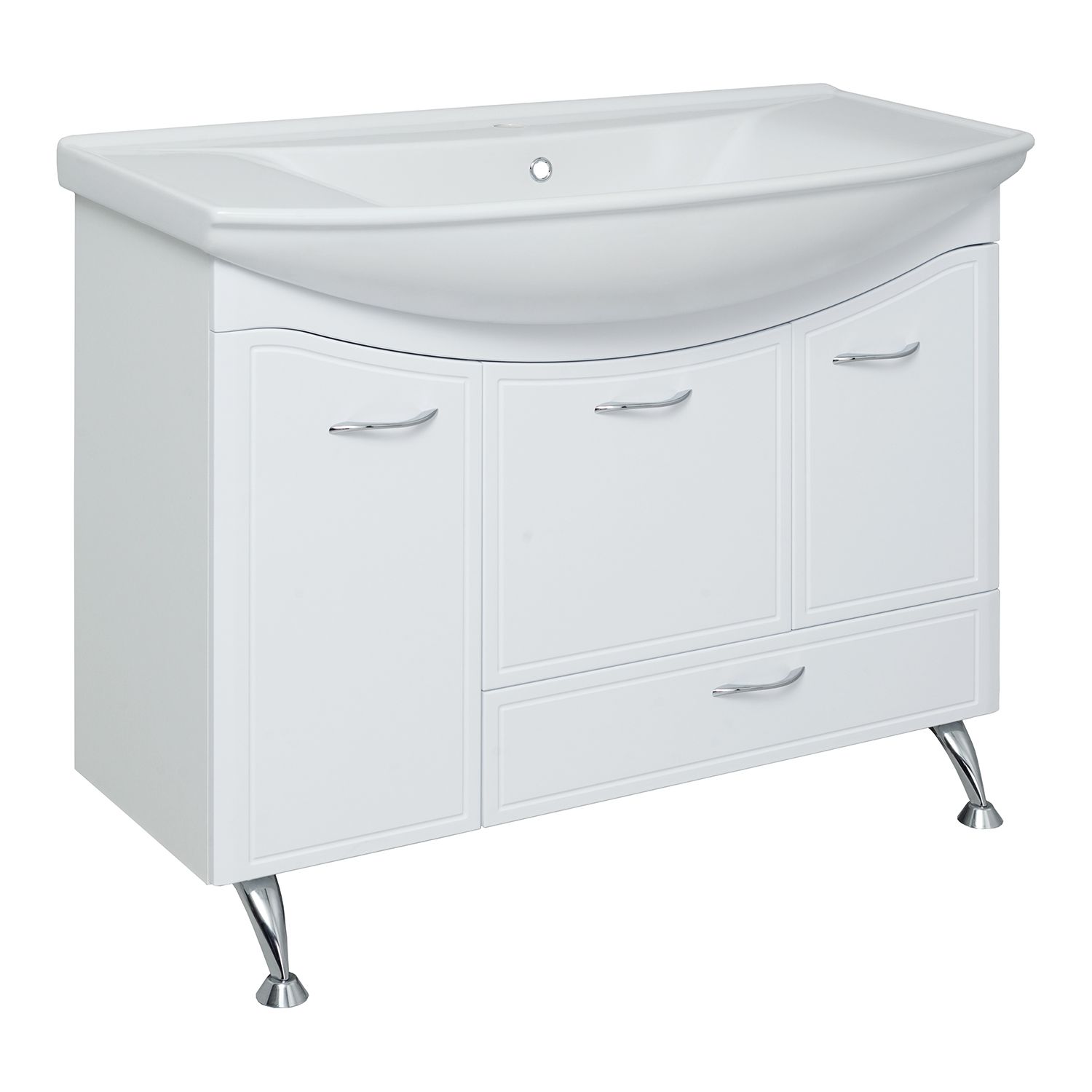 Тумба под умывальник напольная с двумя распашными фасадами, откидной дверкой посередине и нижним выдвижным ящиком. Фасад слева откидной и укомплектован встроенной корзиной для белья. Петли со встроенным доводчиком, ящик - на шариковых направляющих полного выдвижения, ручки - 4шт, ножки хром -2шт, ножки пластик - 2шт.