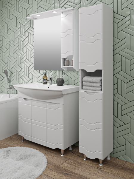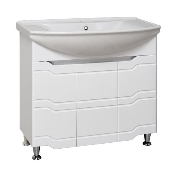 Тумба под умывальник напольная с тремя распашными фасадами и одной внутренней полкой. Петли со встроенным доводчиком, ножки хром - 2шт, ножки пластик -2шт.
