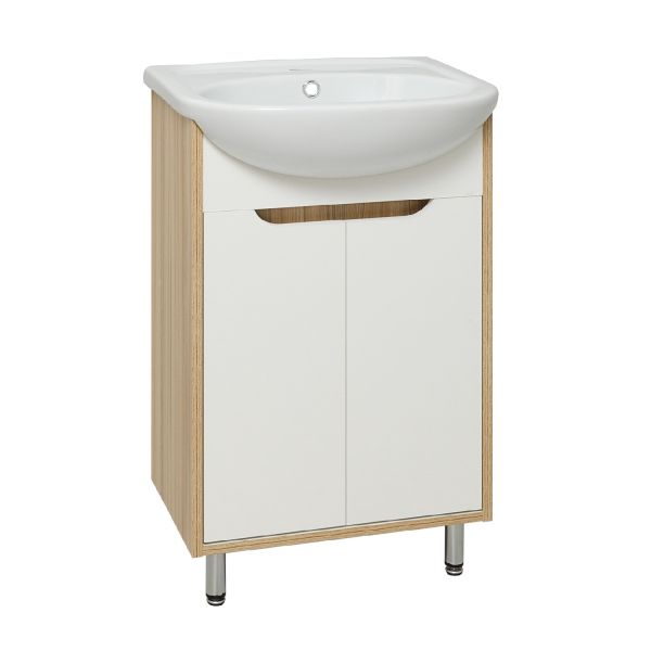 Тумба под умывальник напольная с двумя распашными фасадами и одной внутренней полкой. Ножки хром - 2шт, ножки пластик -2шт.
