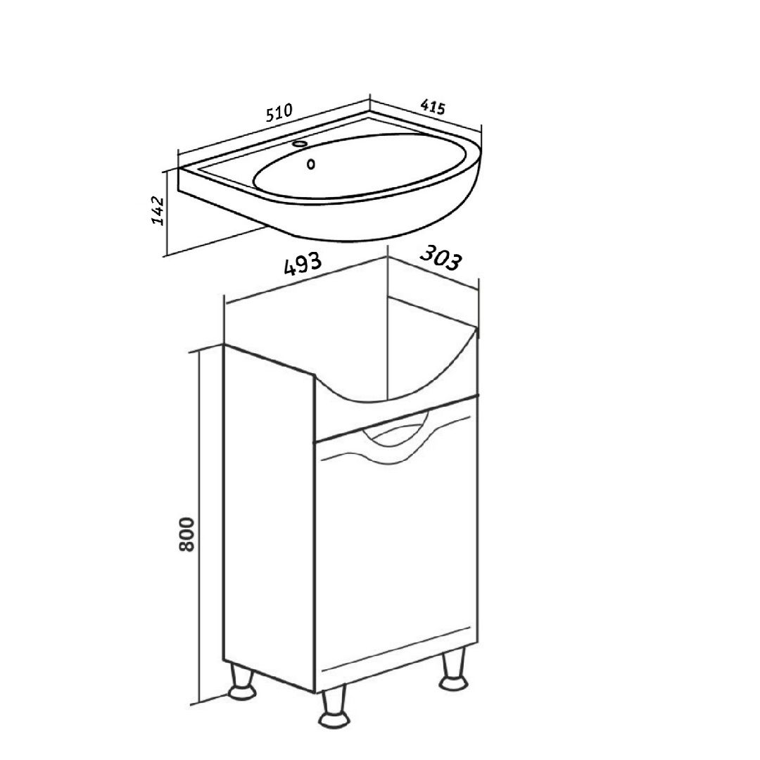 Тумба под умывальник напольная с одним распашным фасадом, открывающимся слева направо (петли справа). Петли со встроенным доводчиком, ручка врезная - 1шт, ножки хром - 2шт, ножки пластик -2шт.