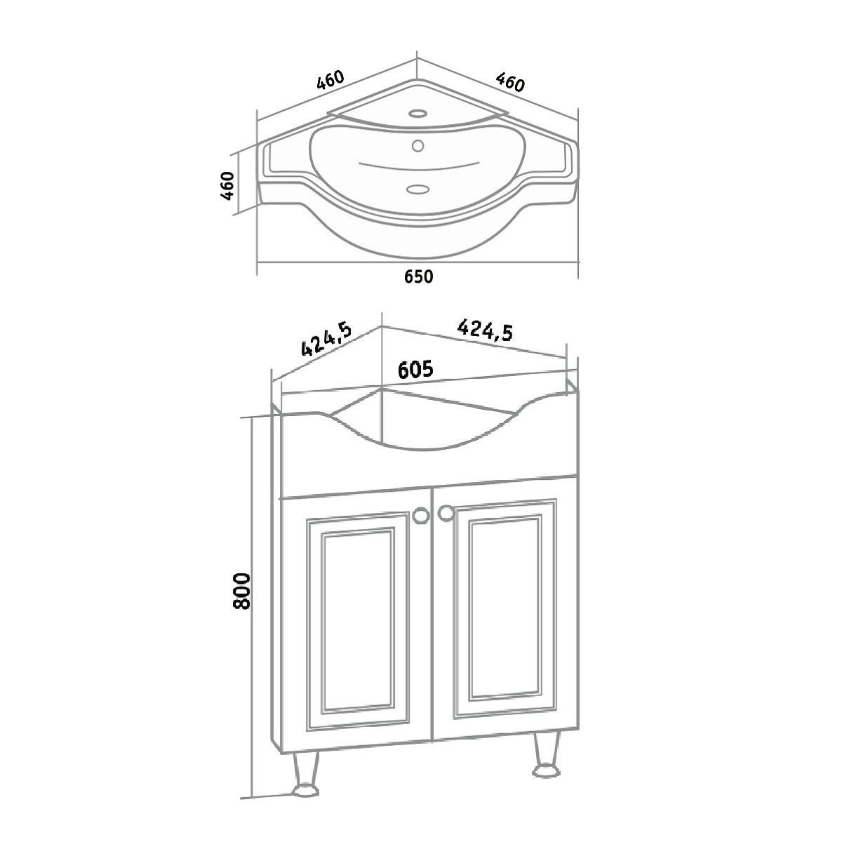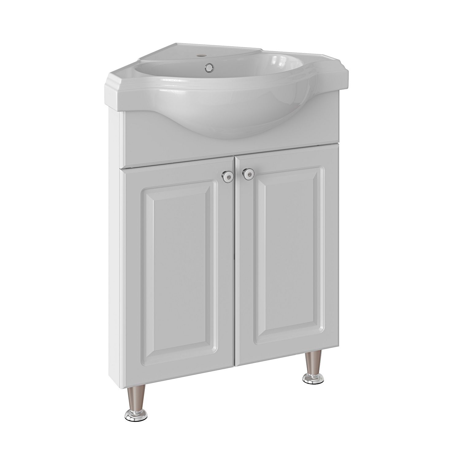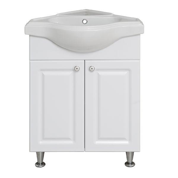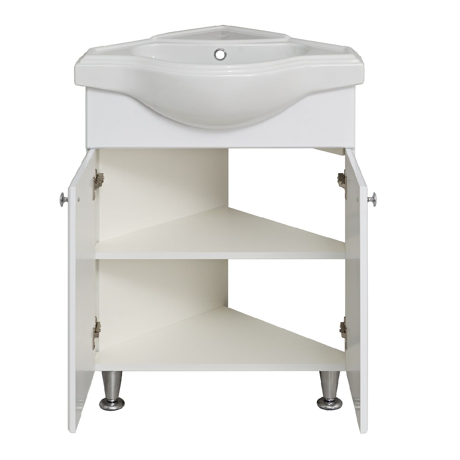Тумба угловая напольная с двумя распашными фасадами и одной внутренней полкой. Петли со встроенным доводчиком, ручки -2шт, ножки хром - 2шт, ножка пластик -1шт.